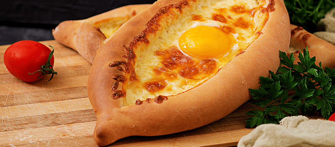 Khachapuri is a stuffed buttery bread that is topped with egg and cheese. It is considered a staple food in Georgia and the cooks there have prepared it in a variety of tasty ways. It is served with Georgian orange wine and traditionally eaten by tearing off the sides and dipping it in the gooey topping of egg and cheese.