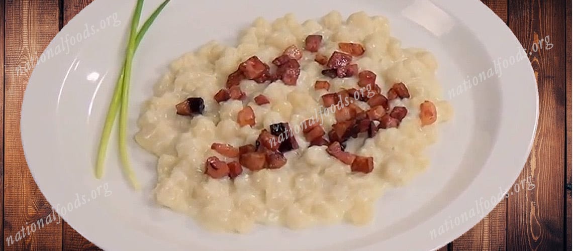 Bryndzové Halušky is the national dish of Slovakia and a defining symbol of Slovak rural cuisine. The dish consists of soft potato dumplings known as halušky, tossed with bryndza, a tangy sheep’s milk cheese, and topped with crispy bacon and rendered fat. The dish emerged from Slovakia’s agrarian past, when farming communities relied heavily on potatoes and sheep’s milk. Bryndza production became widespread in mountainous regions, where sheep grazing was common, making the cheese an accessible and essential ingredient. Combined with potatoes, it created a filling, calorie-rich meal well suited to physically demanding farm work. Bryndzové Halušky is widely eaten in homes and restaurants throughout Slovakia and holds cultural importance beyond everyday meals. It is the centerpiece of the annual Halušky Festival in the village of Turecká, where cooks compete to prepare the best version of the dish using traditional techniques. Traditionally, the meal is accompanied by žinčica, a sour sheep’s milk drink that balances the richness of the cheese and bacon. Today, Bryndzové Halušky represents national pride, simplicity, and the enduring connection between Slovak cuisine and its agricultural roots.